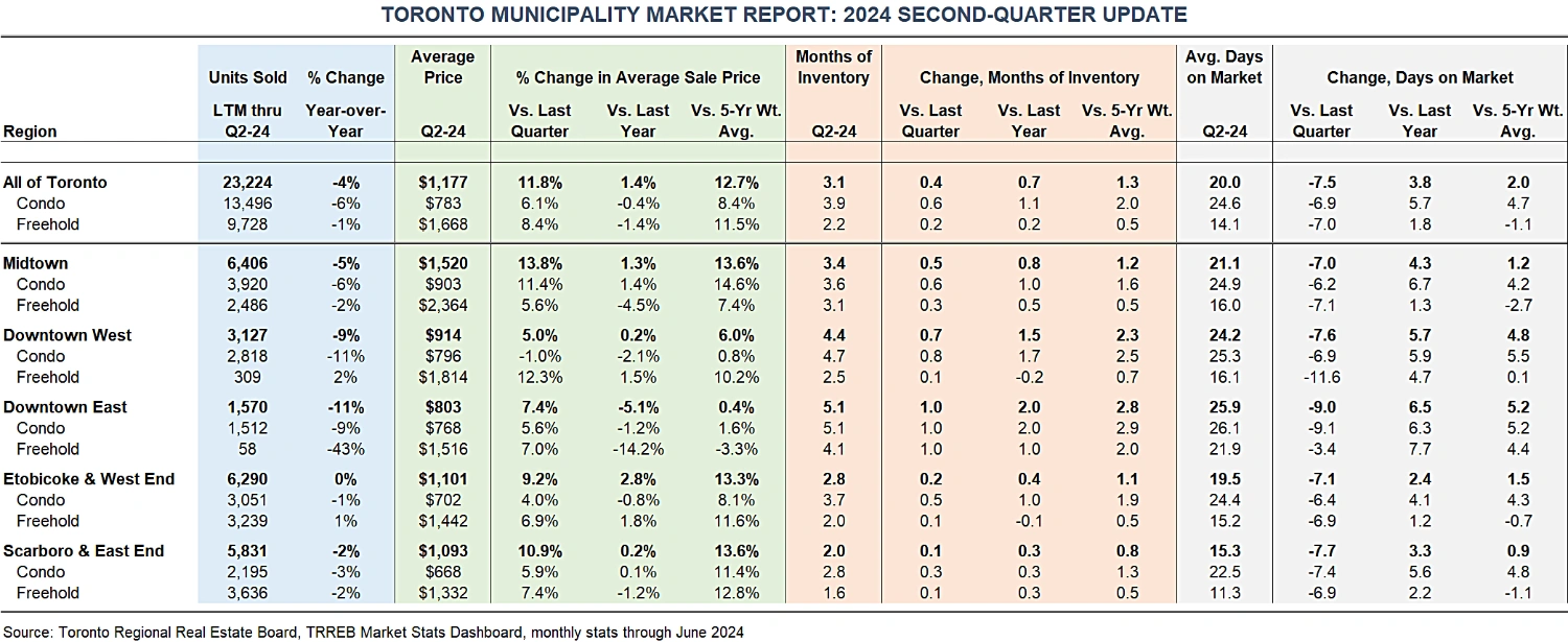 Toronto prices rose sharply in the second quarter but down slightly year-over-year with higher inventory levels particularly for condos; sales activity in the first half of 2024 is down compared to H1-2023